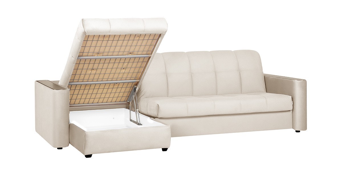 Особенностью диванов с механизмом Аккордеон является просторное и ровное спальное место, несмотря на компактные размеры дивана в собранном положении. А также возможность встроить вместительный бельевой ящик. В данном механизме исключается возникновение скрипа благодаря сиденью дивана, которое выполнено на металлической сетке. Каждая из трех секций спального места имеет по 4 твердые точки опоры, которые исключают вероятность скрипа. Уникальная конструкция позволяет фиксировать сиденье почти в вертикальном положении, что обеспечивает самый комфортный доступ к бельевому ящику.