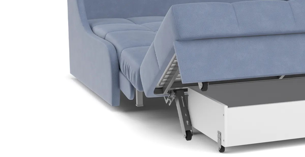 Особенностью диванов с механизмом Аккордеон является просторное и ровное спальное место, несмотря на компактные размеры дивана в собранном положении. А также возможность встроить вместительный бельевой ящик. В данном механизме исключается возникновение скрипа благодаря сиденью дивана, которое выполнено на металлической сетке. Каждая из трех секций спального места имеет по 4 твердые точки опоры, которые исключают вероятность скрипа. Уникальная конструкция позволяет фиксировать сиденье почти в вертикальном положении, что обеспечивает самый комфортный доступ к бельевому ящику.