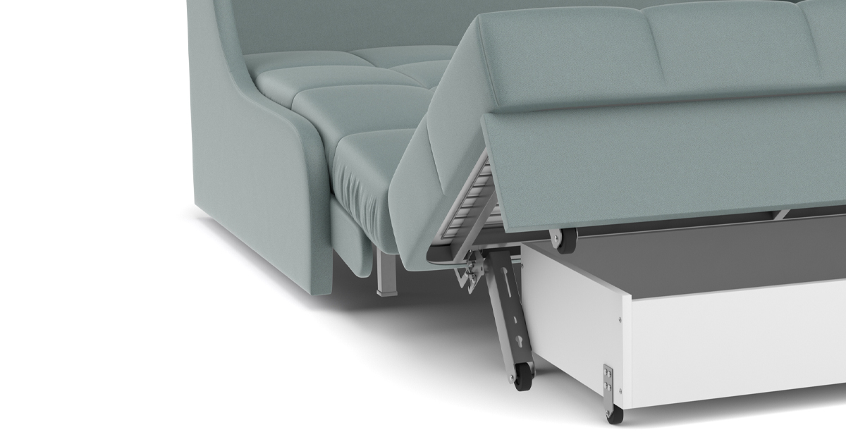 Особенностью диванов с механизмом Аккордеон является просторное и ровное спальное место, несмотря на компактные размеры дивана в собранном положении. А также возможность встроить вместительный бельевой ящик. В данном механизме исключается возникновение скрипа благодаря сиденью дивана, которое выполнено на металлической сетке. Каждая из трех секций спального места имеет по 4 твердые точки опоры, которые исключают вероятность скрипа. Уникальная конструкция позволяет фиксировать сиденье почти в вертикальном положении, что обеспечивает самый комфортный доступ к бельевому ящику.