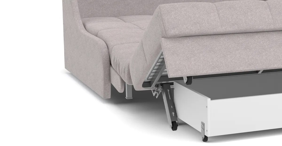 Особенностью диванов с механизмом Аккордеон является просторное и ровное спальное место, несмотря на компактные размеры дивана в собранном положении. А также возможность встроить вместительный бельевой ящик. В данном механизме исключается возникновение скрипа благодаря сиденью дивана, которое выполнено на металлической сетке. Каждая из трех секций спального места имеет по 4 твердые точки опоры, которые исключают вероятность скрипа. Уникальная конструкция позволяет фиксировать сиденье почти в вертикальном положении, что обеспечивает самый комфортный доступ к бельевому ящику.