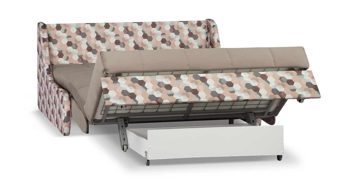 Особенностью диванов с механизмом Аккордеон является просторное и ровное спальное место, несмотря на компактные размеры дивана в собранном положении. А также возможность встроить вместительный бельевой ящик. В данном механизме исключается возникновение скрипа благодаря сиденью дивана, которое выполнено на металлической сетке. Каждая из трех секций спального места имеет по 4 твердые точки опоры, которые исключают вероятность скрипа. Уникальная конструкция позволяет фиксировать сиденье почти в вертикальном положении, что обеспечивает самый комфортный доступ к бельевому ящику.