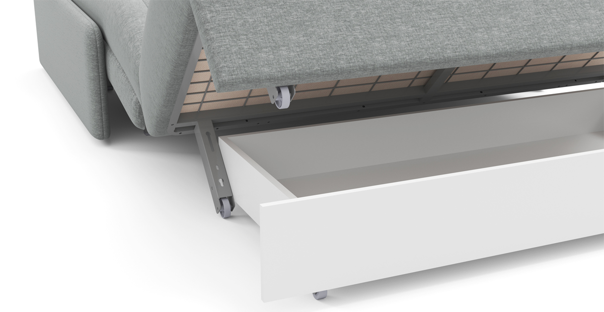 Особенностью диванов с механизмом Аккордеон является просторное и ровное спальное место, несмотря на компактные размеры дивана в собранном положении. А также возможность встроить вместительный бельевой ящик. В данном механизме исключается возникновение скрипа благодаря сиденью дивана, которое выполнено на металлической сетке. Каждая из трех секций спального места имеет по 4 твердые точки опоры, которые исключают вероятность скрипа. Уникальная конструкция позволяет фиксировать сиденье почти в вертикальном положении, что обеспечивает самый комфортный доступ к бельевому ящику.
