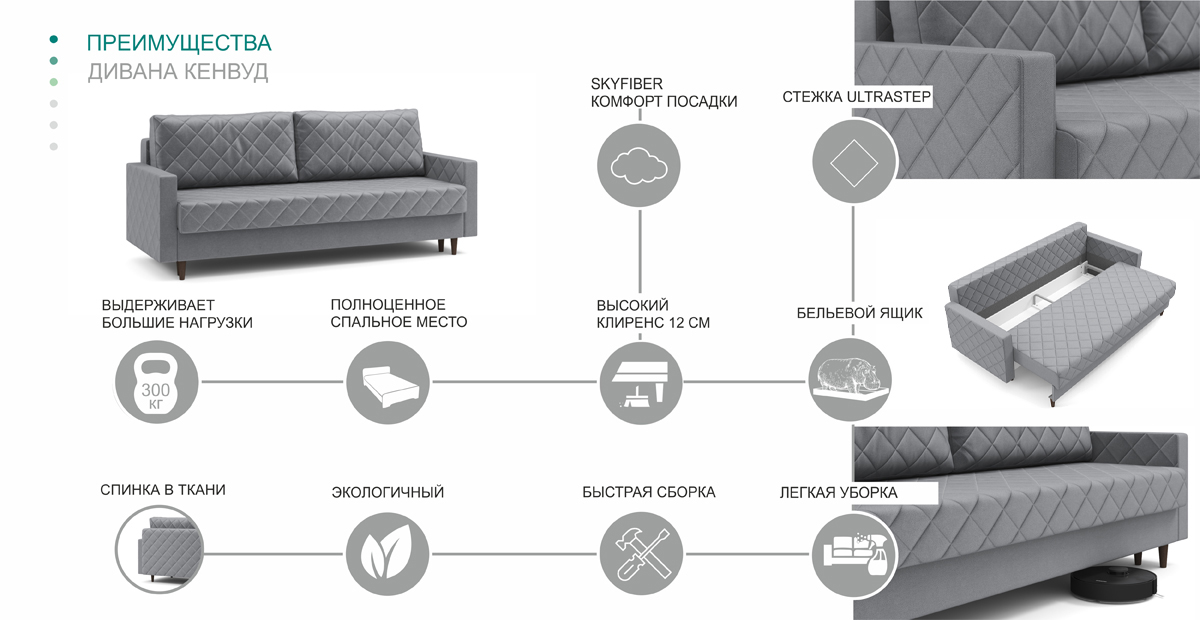 Комфорт дивана обеспечивают мягкие приспинные подушки и продуманная эргономика посадочного места. Удобная посадка сделает отдых на диване Кенвуд приятным и эффективным.
