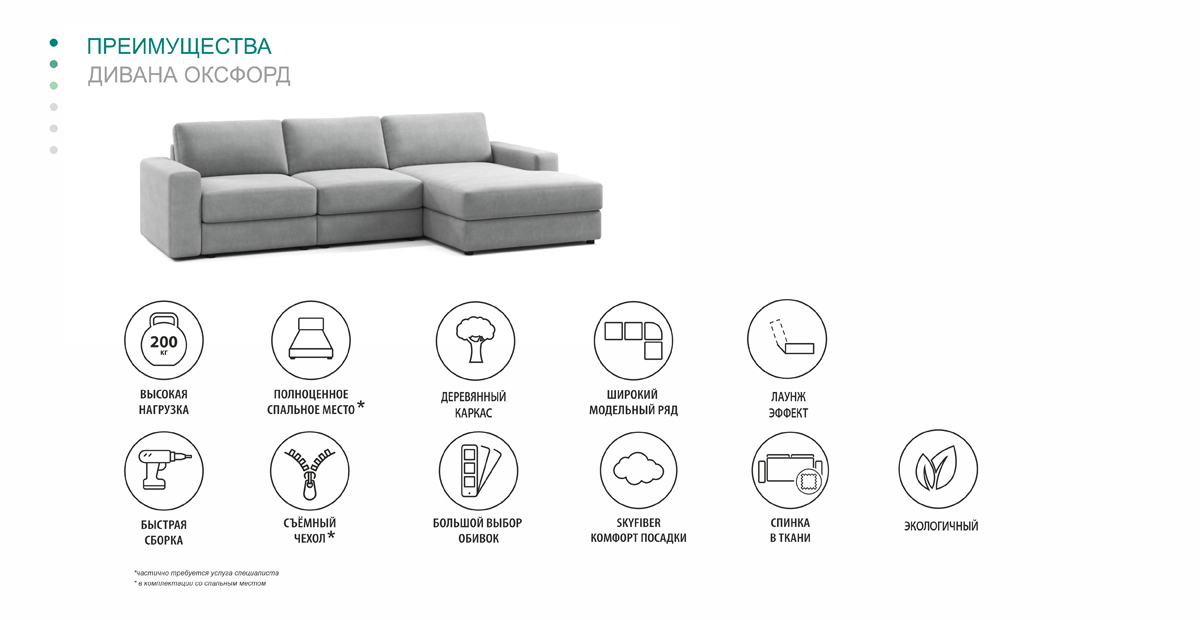 Стильный диван Оксфорд – солидный и роскошный даже в компактных размерах. Задняя спинка выполнена из основной ткани, поэтому Оксфорду всегда найдётся место, он идеален для разделения пространства.
