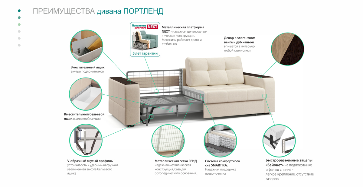Мне очень понравился диван Портленд, заказали через салон его в новых Черемушках. Доставка была оформлена на 14 число. 13-го подтвердили через SMS. Привезли без опозданий, занесли в квартиру и поставили на место. Пока что рано делать выводы по поводу надежности, но механизм выглядит очень солидно.