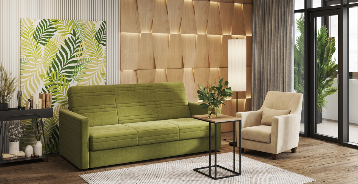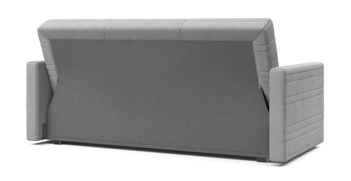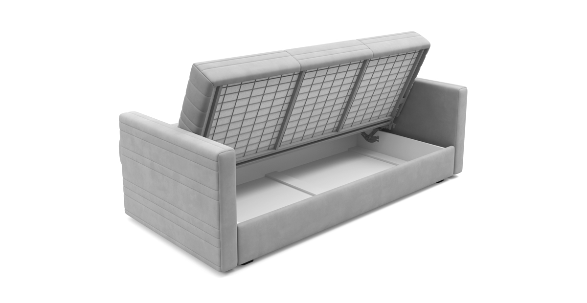 Представленный диван с механизмом Клик-кляк, являющимся усовершенствованной версией механизма Книжка, позволяет легким движением превратить компактный диван в просторное спальное место без зазоров посередине. Особенностью такого механизма является возможность трансформации дивана в три положения – для сидения, отдыха полулежа и сна.