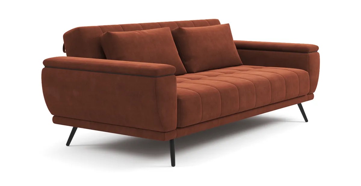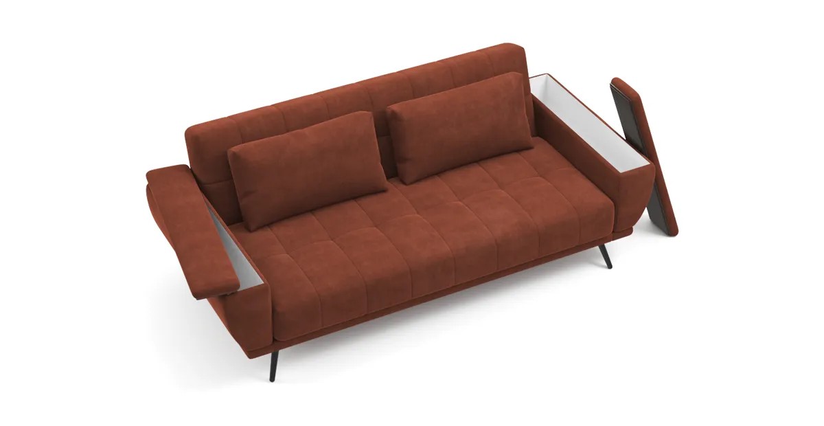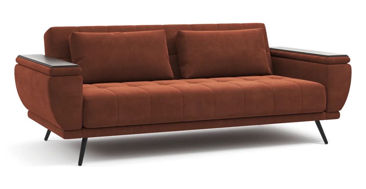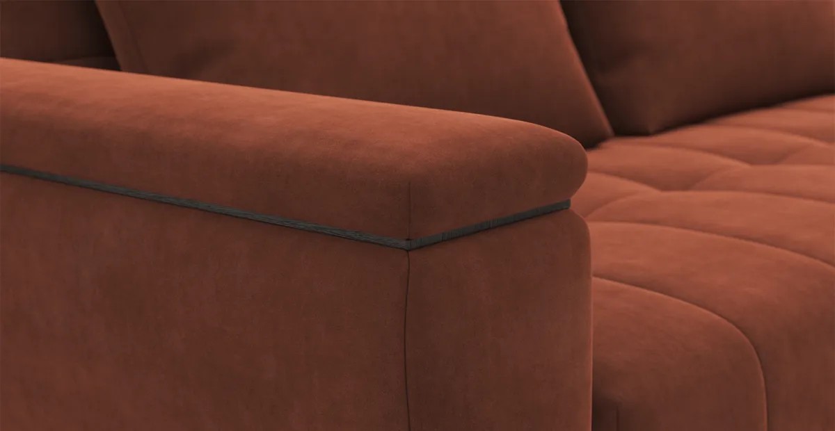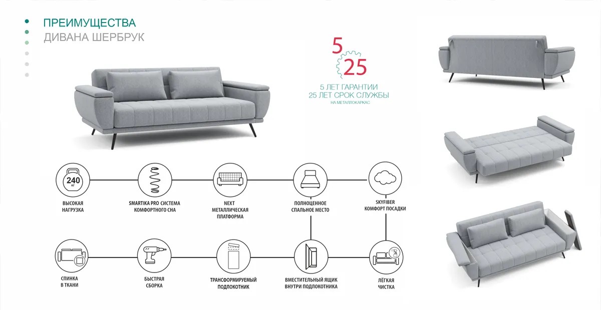 Стильный диван Шербрук NEXT на высоких ножках сочетает в себе современные тенденции и комфорт. Привлекательный дизайн с плавными и округлыми линиями подойдёт любому интерьеру. Необычные подлокотники придают дивану изюминку не только во внешнем виде, но и в практичности. Две ниши в них заменяют традиционный ящик для белья. Верхняя часть каждого из них снимается и ставится любой стороной вверх, превращаясь из мягкого варианта в подлокотник с декором цвета «венге» и обратно по желанию. Инновационный наполнитель Skyfiber сохраняет форму и комфортную упругость приспинных подушек. Механизм трансформации позволяет поставить диван вплотную к стене и легко превращает его в удобное спальное место без стыков. Матрас 21 см высотой с независимым пружинным блоком Smartika Pro выдерживает большую нагрузку (до 240 кг), эффективно распределяя её. Единая металлическая конструкция основания спинки и механизма трансформации – надёжный и долговечный каркас NEXT. Он легко выдерживает ежедневную активную эксплуатацию. Благодаря обивке задней спинки, диван можно применять для зонирования пространства. За ним легко ухаживать: чехол приспинных подушек съёмный, на молнии.