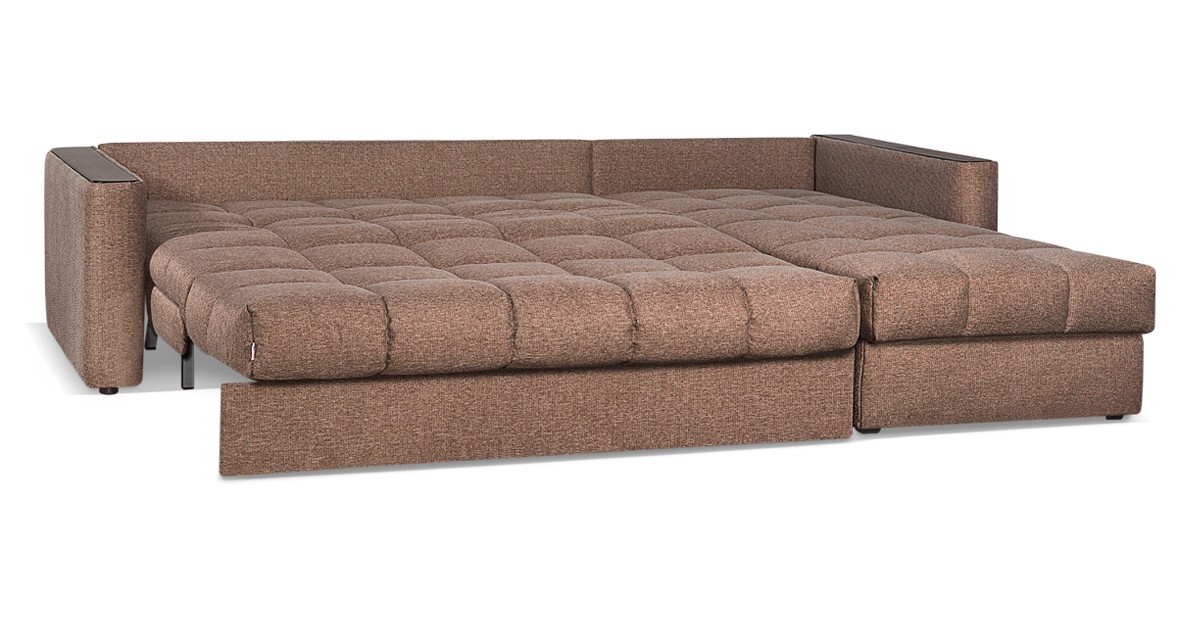 Модульный диван Сидней дает возможность моделировать диван на свой вкус и под габариты конкретного помещения. Термостойкое покрытие подлокотников и столешницы позволяет ставить чашку с горячим напитком. Повышенная мягкость дивана обеспечивается качественным наполнителем и может подарить максимальный комфорт для самых требовательных покупателей. В качестве дополнительных модулей вы можете выбрать угловую секцию с удобными полками, столиком и вместительным ящиком для хранения или мягкий угол — в зависимости от предпочтений. Модернизированный механизм Аккордеон имеет более прочную конструкцию в сравнении с предыдущими аналогами, снабжен металлической сеткой в местах усиленной нагрузки и раскладывается вперед, превращаясь в полноценное ровное спальное место без стыков и перепадов высоты.