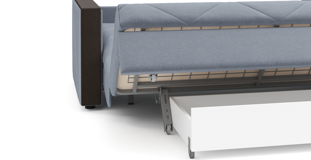 Особенностью диванов с механизмом Аккордеон является просторное и ровное спальное место, несмотря на компактные размеры дивана в собранном положении. А также возможность встроить вместительный бельевой ящик. В данном механизме исключается возникновение скрипа благодаря сиденью дивана, которое выполнено на металлической сетке. Каждая из трех секций спального места имеет по 4 твердые точки опоры, которые исключают вероятность скрипа. Уникальная конструкция позволяет фиксировать сиденье почти в вертикальном положении, что обеспечивает самый комфортный доступ к бельевому ящику.