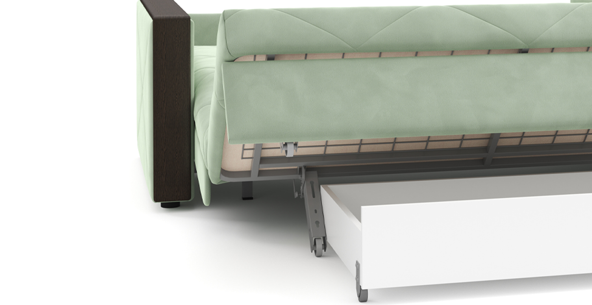 Особенностью диванов с механизмом Аккордеон является просторное и ровное спальное место, несмотря на компактные размеры дивана в собранном положении. А также возможность встроить вместительный бельевой ящик. В данном механизме исключается возникновение скрипа благодаря сиденью дивана, которое выполнено на металлической сетке. Каждая из трех секций спального места имеет по 4 твердые точки опоры, которые исключают вероятность скрипа. Уникальная конструкция позволяет фиксировать сиденье почти в вертикальном положении, что обеспечивает самый комфортный доступ к бельевому ящику.