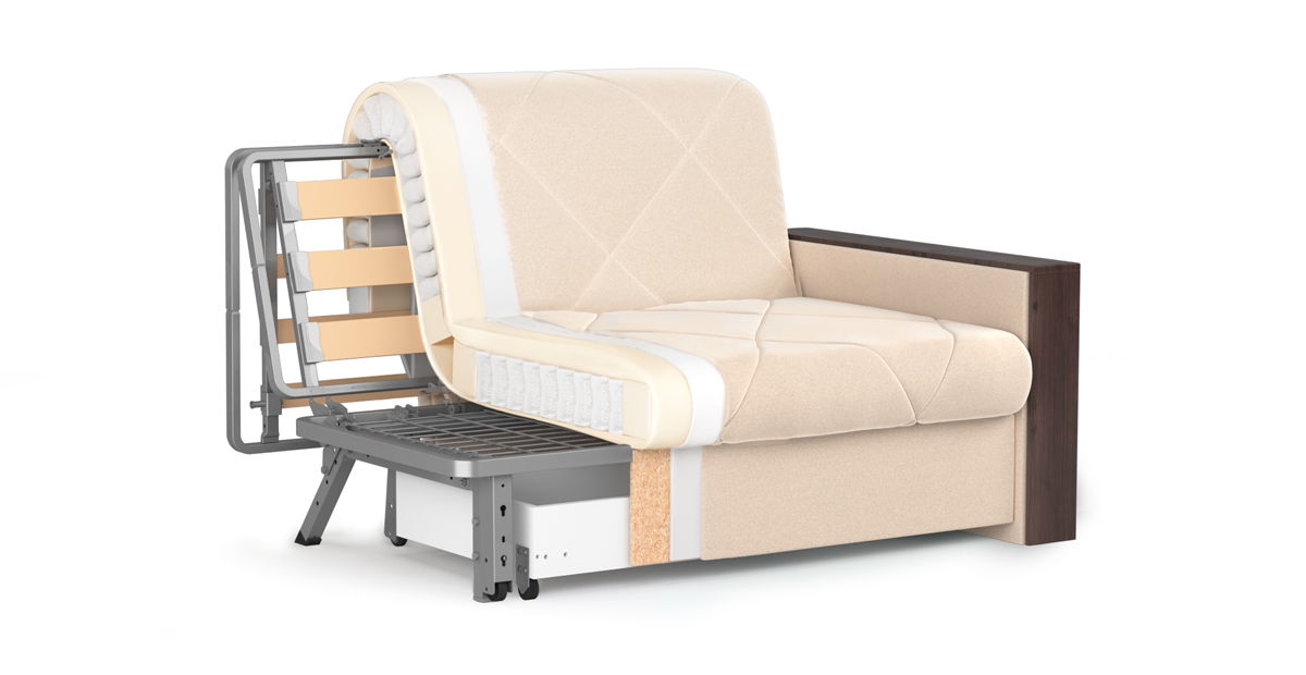 Особенностью диванов с механизмом Аккордеон является просторное и ровное спальное место, несмотря на компактные размеры дивана в собранном положении. А также возможность встроить вместительный бельевой ящик. В данном механизме исключается возникновение скрипа благодаря сиденью дивана, которое выполнено на металлической сетке. Каждая из трех секций спального места имеет по 4 твердые точки опоры, которые исключают вероятность скрипа. Уникальная конструкция позволяет фиксировать сиденье почти в вертикальном положении, что обеспечивает самый комфортный доступ к бельевому ящику.