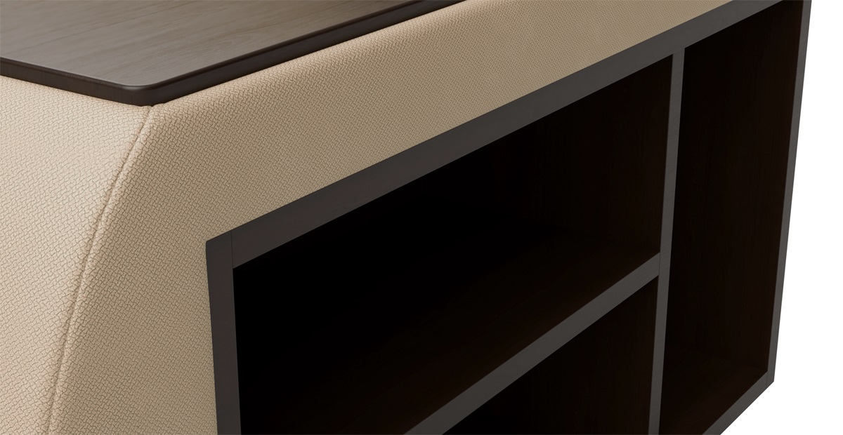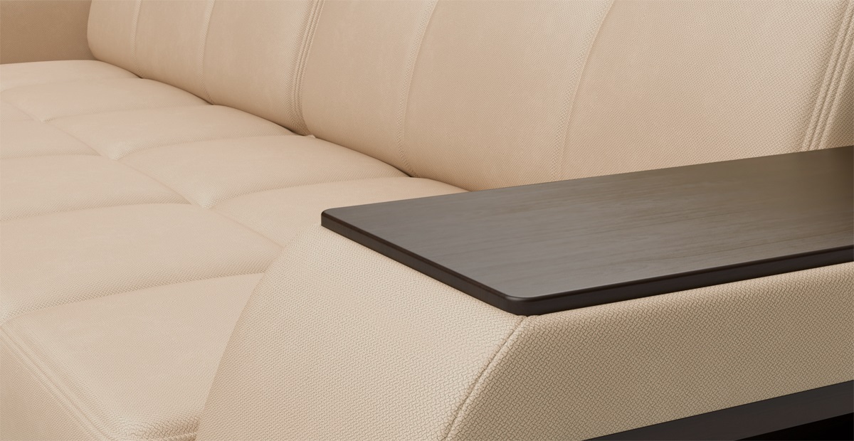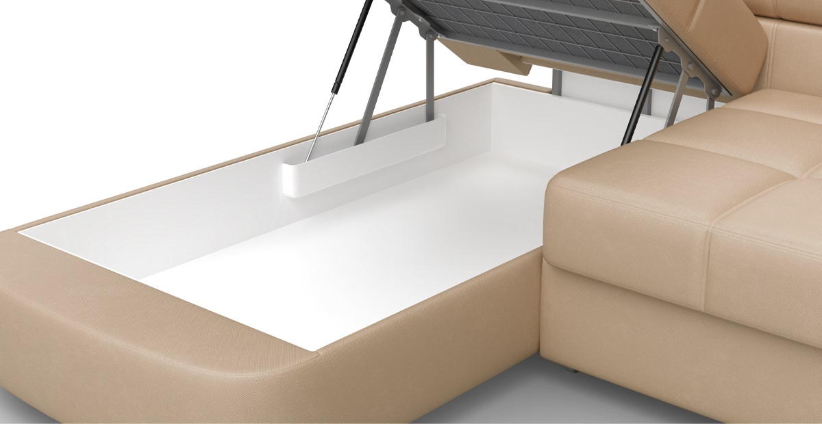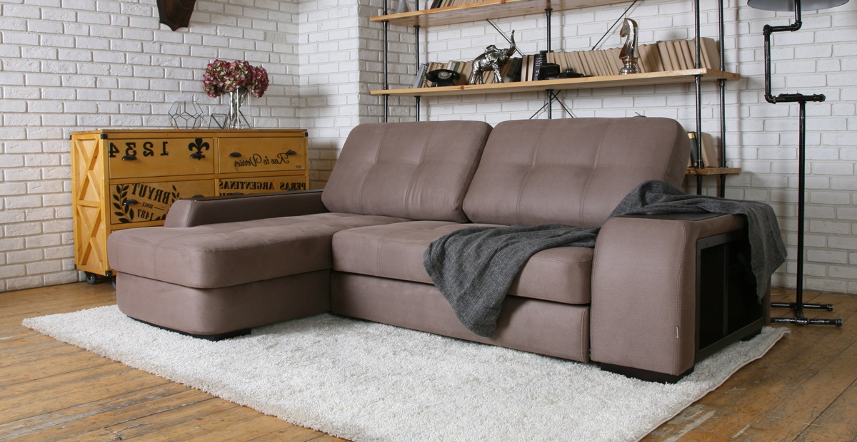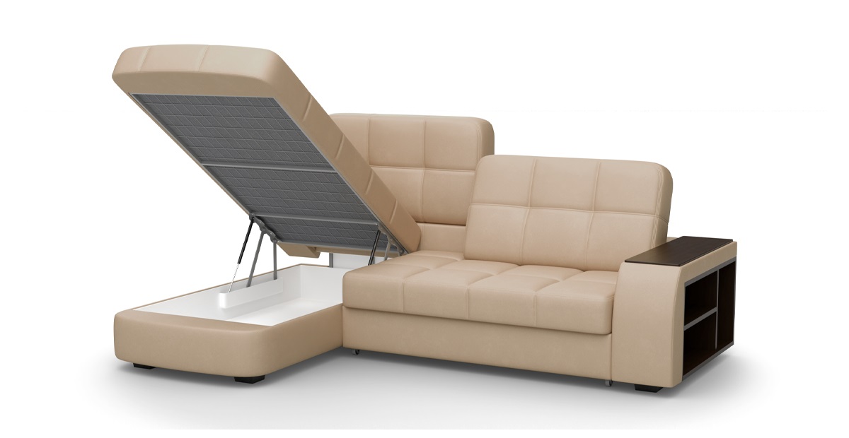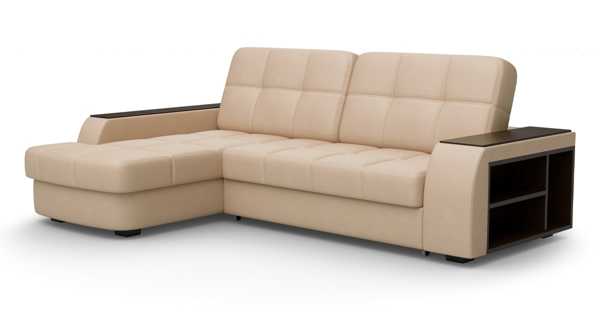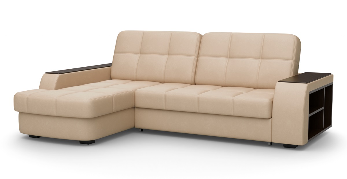 Стильный угловой диван Брюссель выполнен на металлическом каркасе NEXT, который обеспечивает надежность и долговечность. Главная фишка этой модели — «умные» подушки, которые с помощью подъемного механизма поднимаются вровень со спинкой дивана. Это позволяет сделать спальное место шире и не думать о том, куда деть подушки на ночь. Расширенный бельевой ящик – ещё одно преимущество углового дивана Брюссель NEXT. Подлокотник оттоманки монтируется на неё и поднимается вместе с ней. Благодаря этому бельевой ящик имеет правильную прямоугольную форму и дополнительное пространство под подлокотником. Поскольку положение сидения поддается регулировке, поверхность оттоманки также имеет правильную прямоугольную форму. Одной из отличительных особенностей этого дивана также является наличие книжной полки и мини-бара, которые задекорированы под дерево. Оформление двойной декоративной строчкой придает дивану роскошный современный вид.