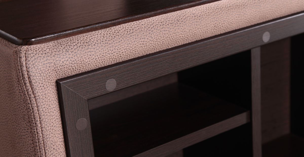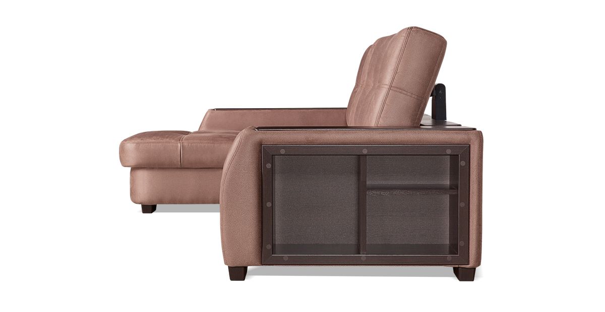 Одной из отличительных особенностей этого дивана также является наличие книжной полки и мини-бара, которые задекорированы под дерево.
