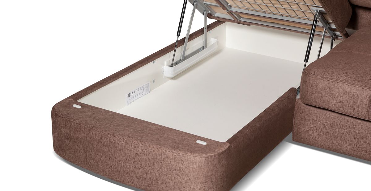 Расширенный бельевой ящик – ещё одно преимущество углового дивана Брюссель NEXT. Подлокотник оттоманки монтируется на неё и поднимается вместе с ней. Благодаря этому бельевой ящик имеет правильную прямоугольную форму и дополнительное пространство под подлокотником. Поскольку положение сидения поддается регулировке, поверхность оттоманки также имеет правильную прямоугольную форму.