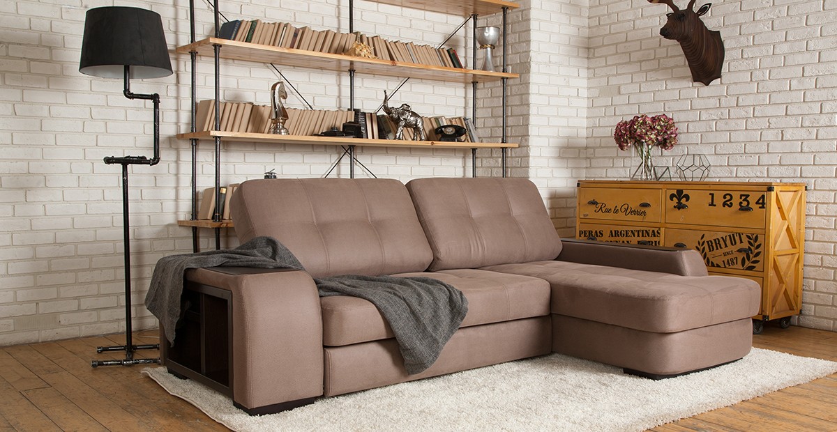 Одной из отличительных особенностей этого дивана также является наличие книжной полки и мини-бара, которые задекорированы под дерево.