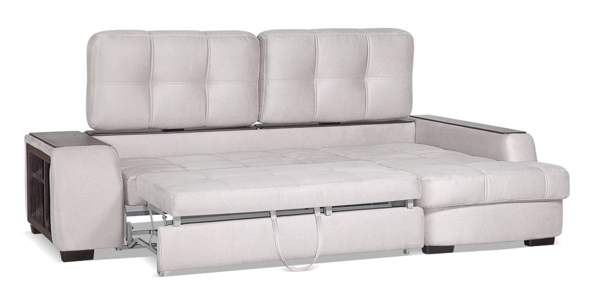 Стильный угловой диван Брюссель выполнен на металлическом каркасе NEXT, который обеспечивает надежность и долговечность. Главная фишка этой модели — «умные» подушки, которые с помощью подъемного механизма поднимаются вровень со спинкой дивана. Это позволяет сделать спальное место шире и не думать о том, куда деть подушки на ночь.