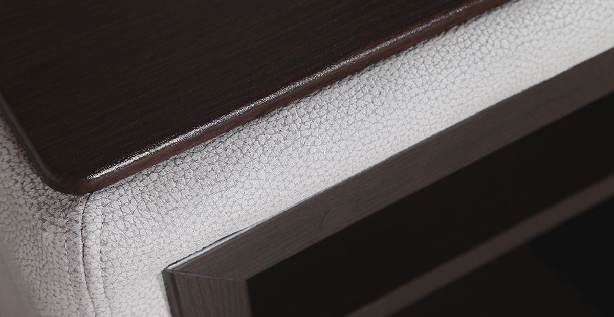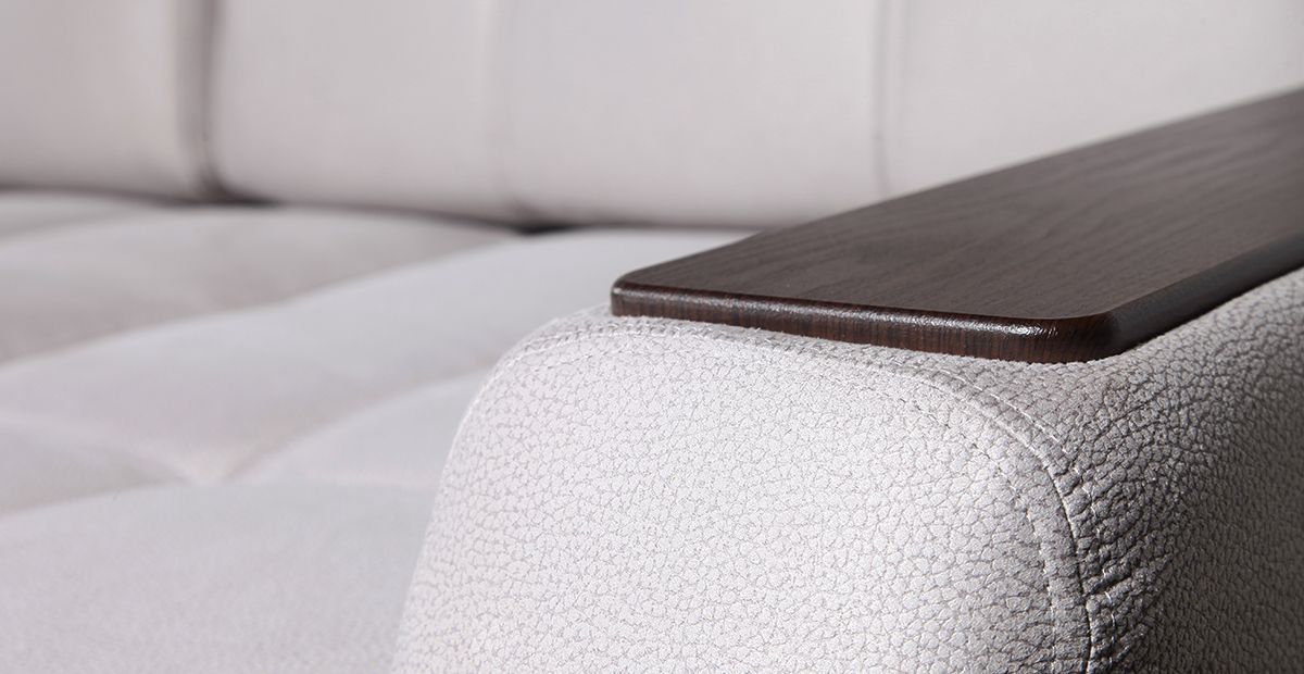 Одной из отличительных особенностей этого дивана также является наличие книжной полки и мини-бара, которые задекорированы под дерево.