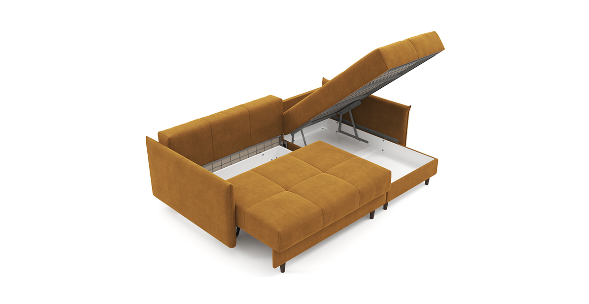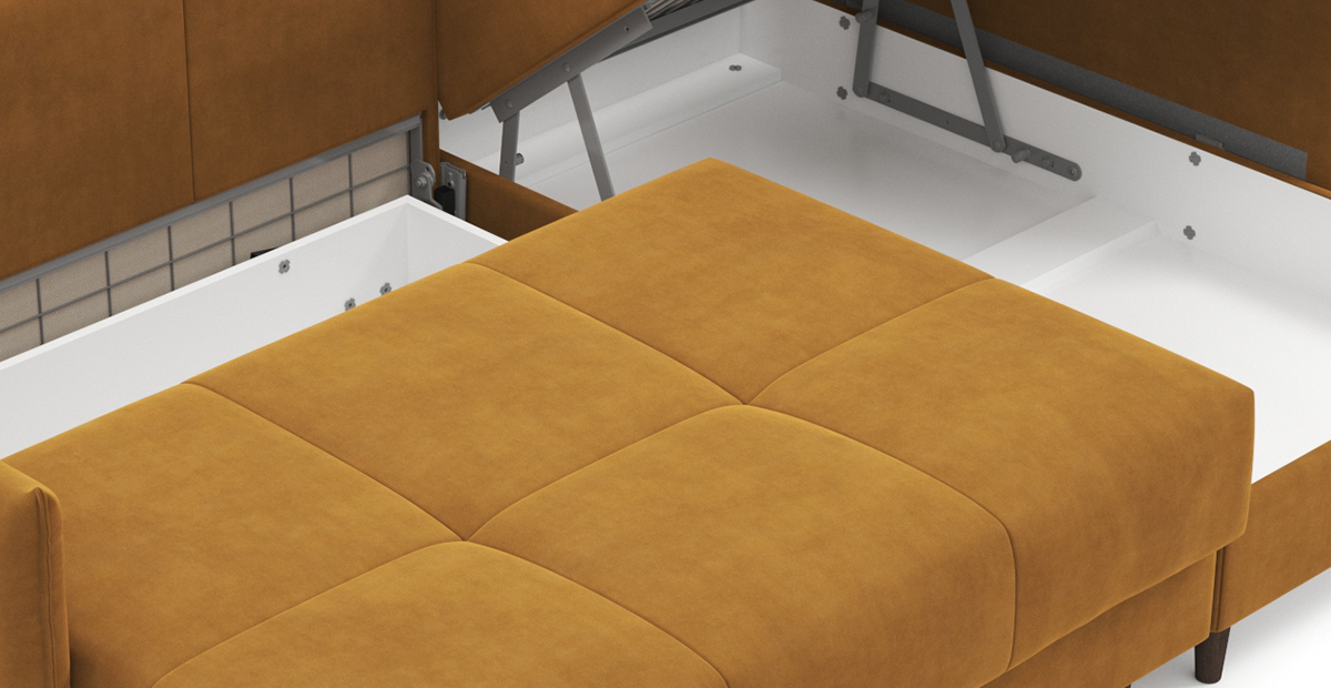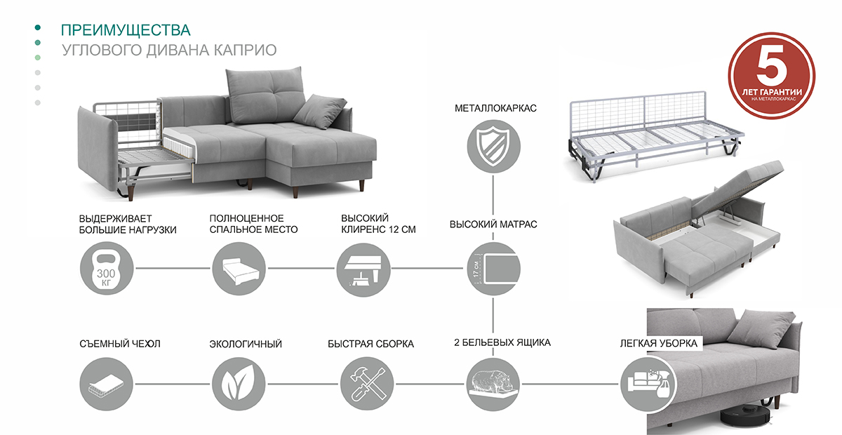 Несмотря на строгие формы, угловой диван Каприо NEXT – это воплощение элегантности и уюта. Компактный и лаконичный, он идеально подойдет для небольшого помещения или для минималистичного интерьера, добавив ему нотки современного стиля. Узкие мягкие подлокотники – актуальный мебельный тренд. Английский шов на приспинных подушках и подлокотниках придаёт дивану оригинальность и ненавязчиво подчеркивает объём и мягкость наполнителя. Декоративная стёжка основной части сиденья и приспиных подушек препятствует растяжению ткани и сохраняет первоначальный красивый внешний вид дивана. Под сидением и в оттоманке расположены вместительные ящики для хранения постельных принадлежностей. Благодаря высоким опорам с лёгкостью можно провести уборку самостоятельно или с помощью робота-пылесоса. Механизм трансформации дивана «Тик-Так» – надежный и долговечный – разработан для каждодневного сна. Материалы, из которых изготовлен Каприо, обеспечивают максимальную безопасность и комфорт эксплуатации в течение всего срока службы дивана. Металлические рамы, используемые в качестве элементов каркаса дивана, имеют высокую прочность, они не деформируются при больших нагрузках, не боятся перепадов температур и влажности. Матрас высотой 17 см с ортопедическим эффектом изготовлен из высокоэкологичных и гипоаллергенных материалов – пенополиуретана самого высокого качества. В основе матраса – независимый пружинный блок «Smartika».