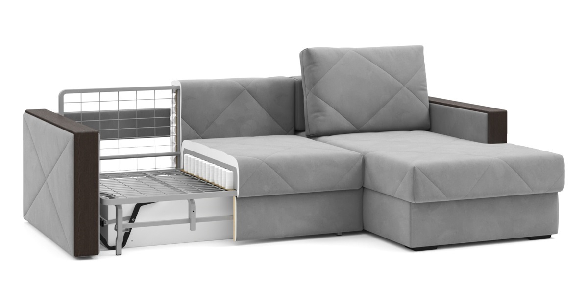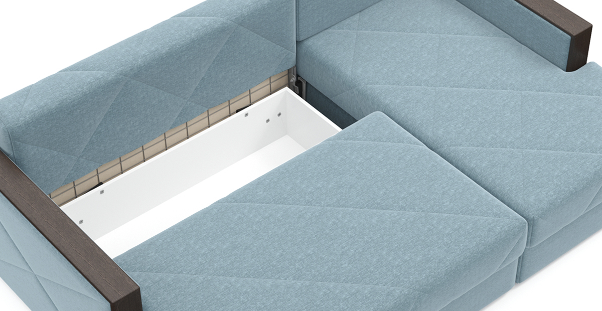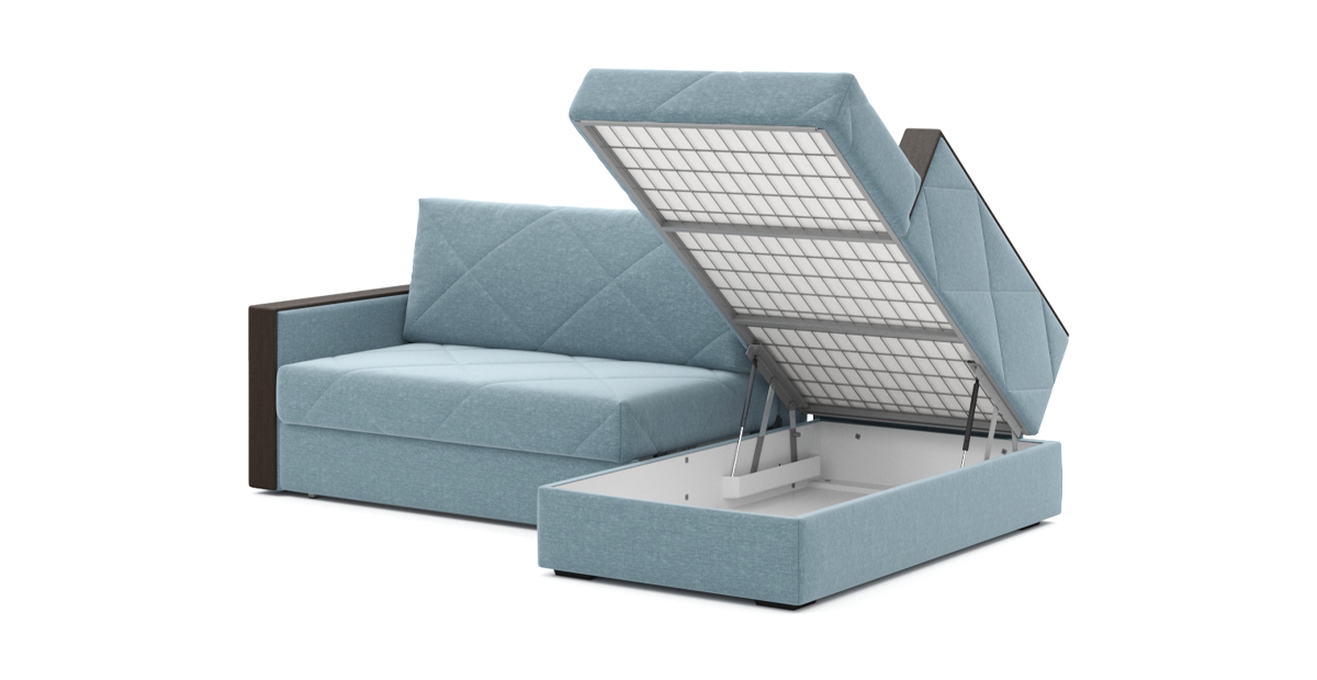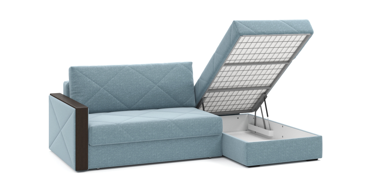 Стильный угловой диван Мюнхен на металлической платформе NEXT – сочетание элегантности и функциональности. Стежка на сидении и спинке не позволит образовываться складкам на обивке, а чехлы на подушках можно снять, чтобы постирать при необходимости. Во вместительном бельевом ящике под сидением можно хранить спальные принадлежности. Кроме этого, любители пить на диване чай или кофе по достоинству оценят широкие подлокотники с деревянными накладками.