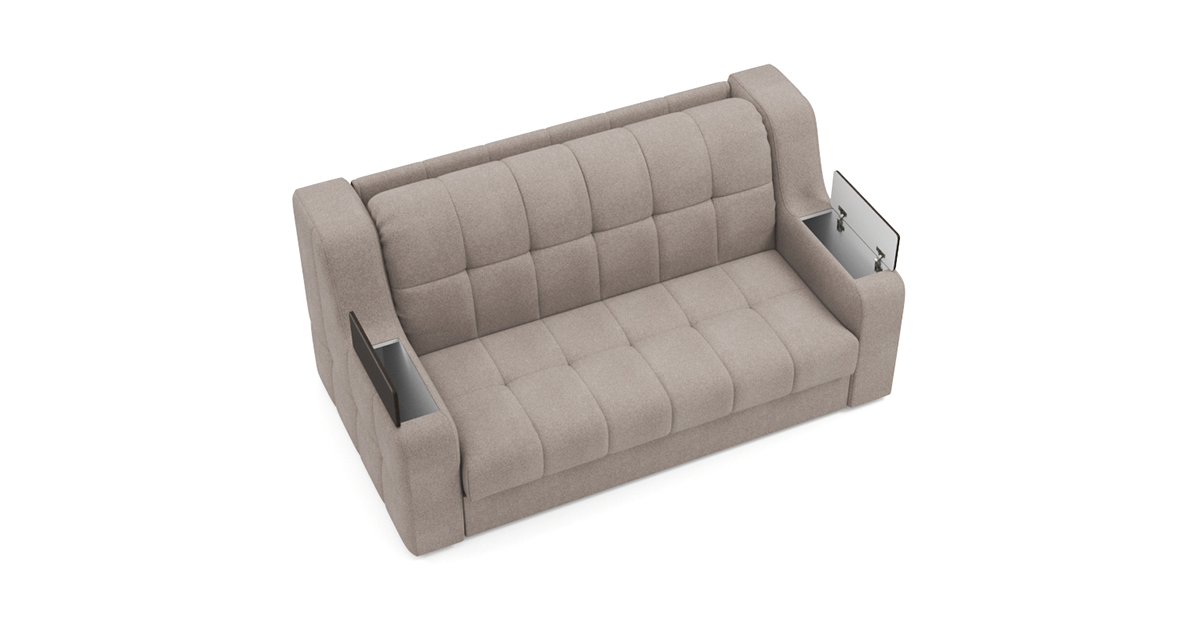 Особенностью диванов с механизмом Аккордеон является просторное и ровное спальное место, несмотря на компактные размеры дивана в собранном положении. А также возможность встроить вместительный бельевой ящик. В данном механизме исключается возникновение скрипа благодаря сиденью дивана, которое выполнено на металлической сетке. Каждая из трех секций спального места имеет по 4 твердые точки опоры, которые исключают вероятность скрипа. Уникальная конструкция позволяет фиксировать сиденье почти в вертикальном положении, что обеспечивает самый комфортный доступ к бельевому ящику.