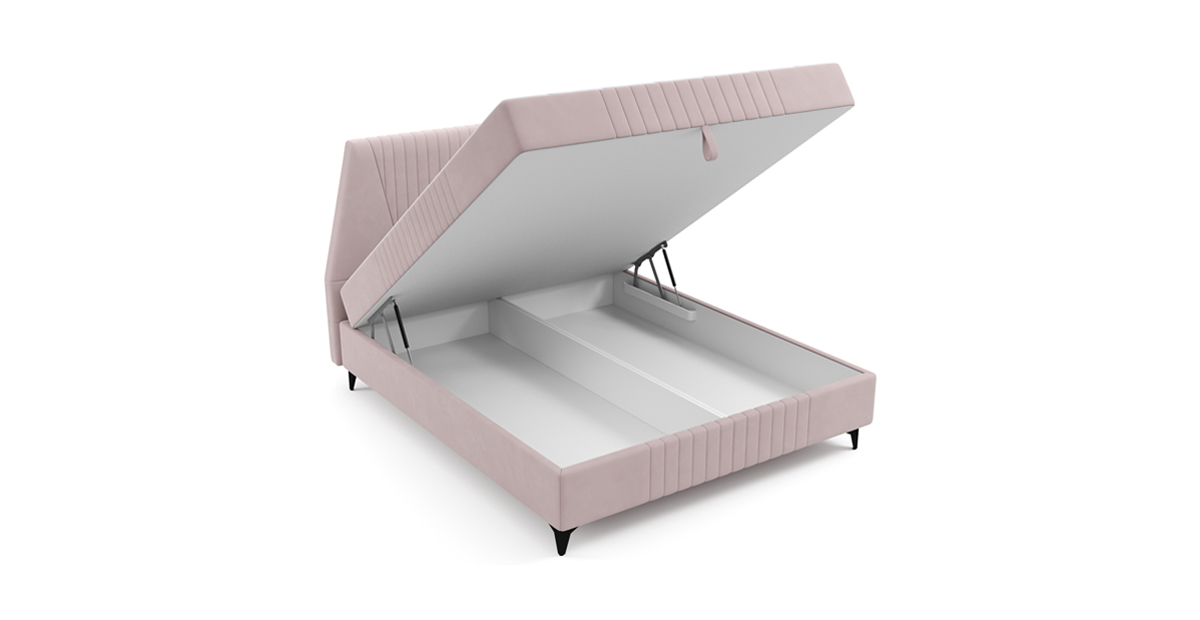 Ее особенности: высокое и мягкое изголовье со стильной стёжкой, интегрированный матрас толщиной 23,5 см с настраиваемой жесткостью.