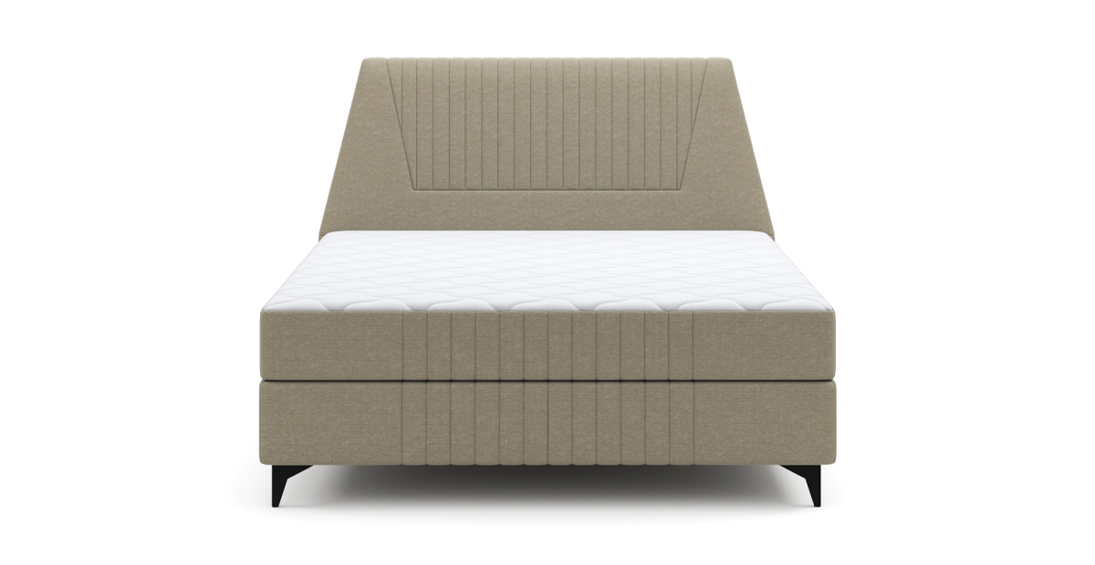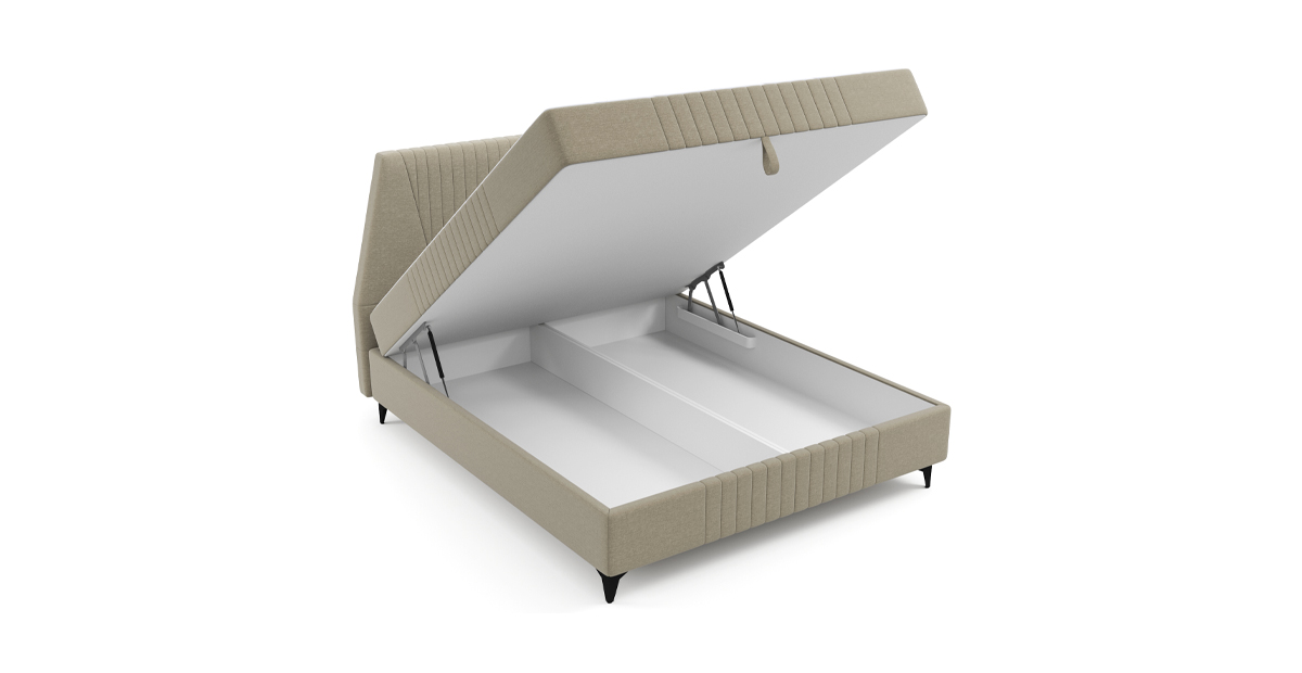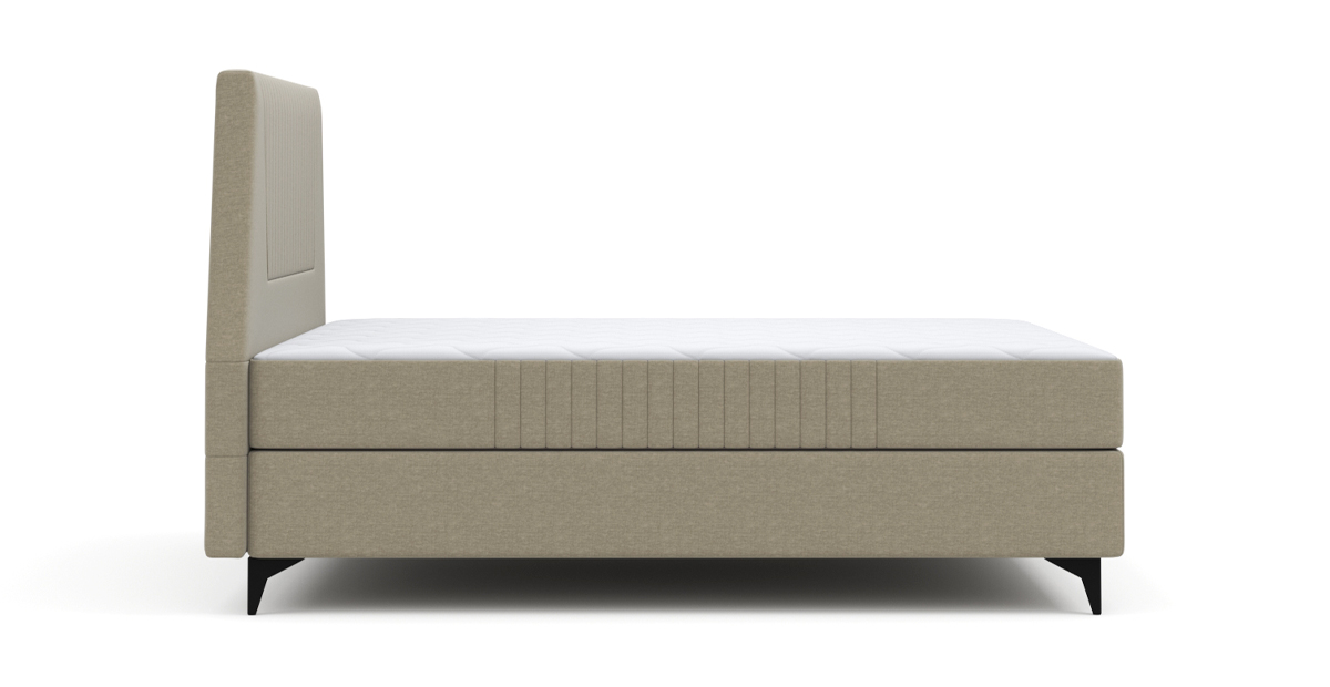 Ее особенности: высокое и мягкое изголовье со стильной стёжкой, интегрированный матрас толщиной 26,5 см с настраиваемой жесткостью.
