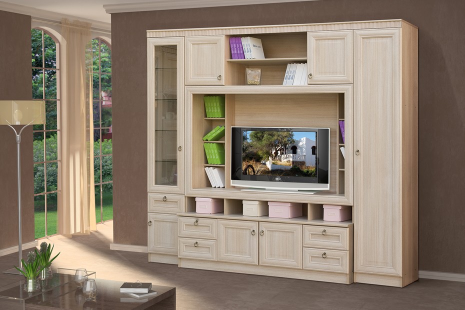 Небольшая аккуратная стенка. Очень вместительная ниша для телевизора, теперь думаем про плазму. Красивый цвет, интересный дизайн, в общем все нормально.