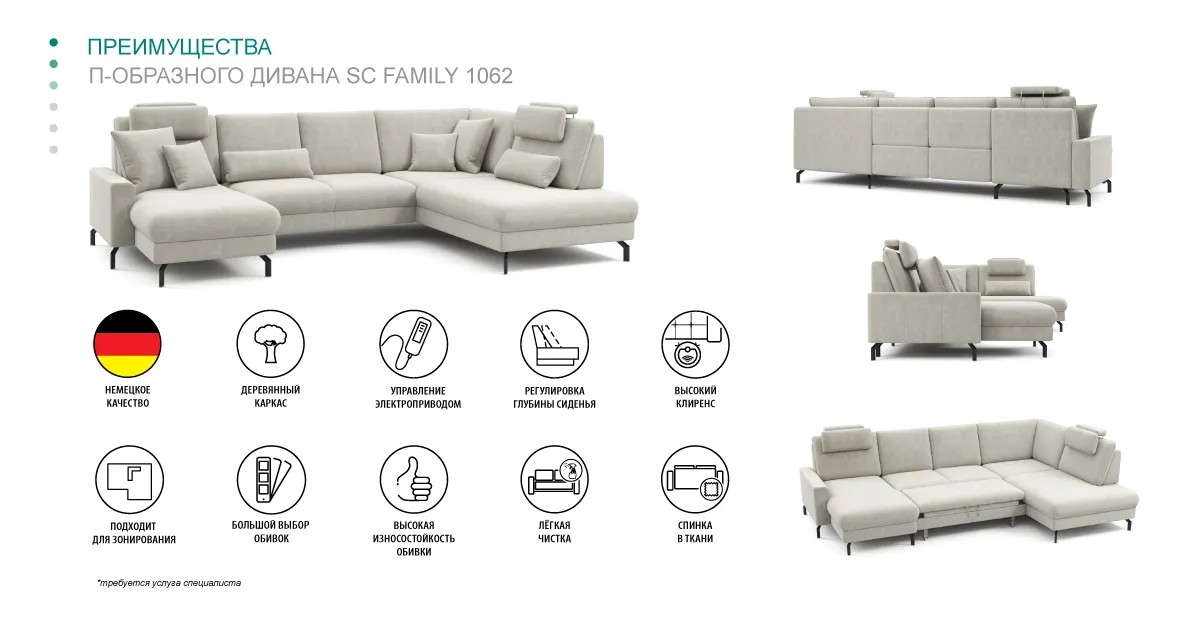 Элегантный модульный диван SC Family 1062 на высоких металлических опорах станет местом притяжения всей семьи. Современные технологии трансформации адаптируют комфорт под индивидуальные предпочтения каждого человека.