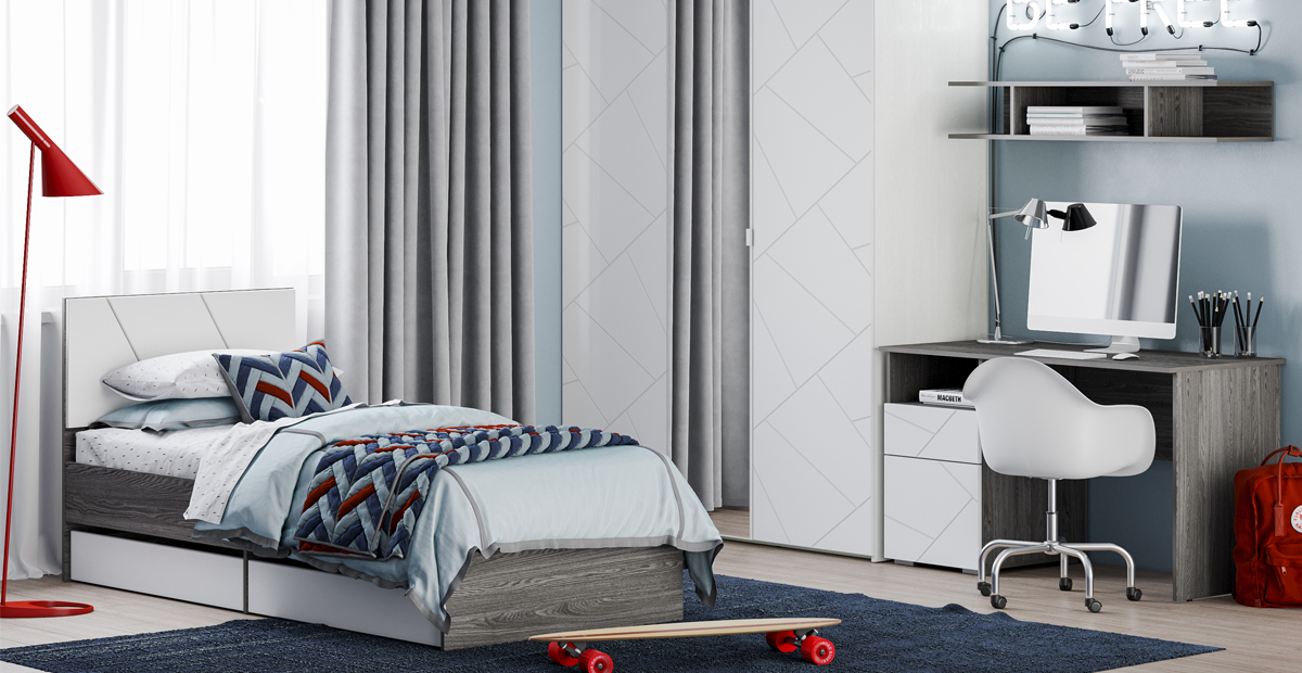 Коллекция Позитано в стиле хай-тек – мебель для людей, предпочитающих смелые современные решения в интерьере. Письменный стол с тумбой, открытой нишей и ящиком – полноценное и удобное место для домашних заданий и отдыха. На него можно поставить компьютер. Технологичный вид столу придают фасады без ручек с ассиметричными наклонными линиями, создающими чёткий геометрический узор. Лёгкое открывание Push-to-Open делает пользование мебелью простым и приятным. Мебель идеальна для создания интерьера в комнате подростка.