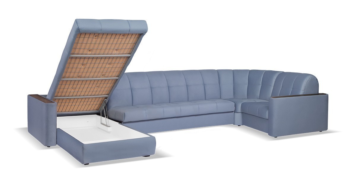 Особенностью диванов с механизмом Аккордеон является просторное и ровное спальное место, несмотря на компактные размеры дивана в собранном положении. А также возможность встроить вместительный бельевой ящик. В данном механизме исключается возникновение скрипа благодаря сиденью дивана, которое выполнено на металлической сетке. Каждая из трех секций спального места имеет по 4 твердые точки опоры, которые исключают вероятность скрипа. Уникальная конструкция позволяет фиксировать сиденье почти в вертикальном положении, что обеспечивает самый комфортный доступ к бельевому ящику.