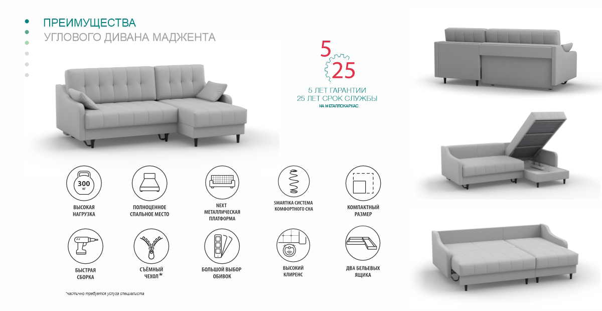 Маджента с декоративными подушками – красивый угловой диван в модном стиле mid century. Универсальные прямые формы и изящные линии подлокотников в сочетании с высокими опорами создаёт классический образ, который идеально впишется в современный функциональный интерьер. Благодаря спинке из основной ткани с его помощью можно зонировать пространство.