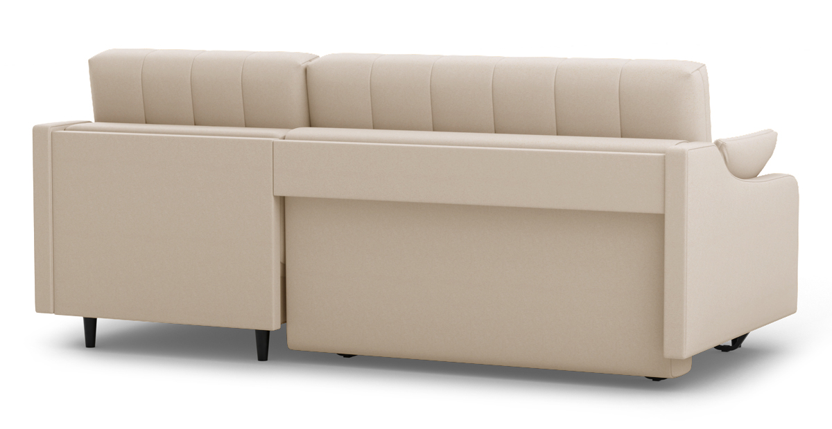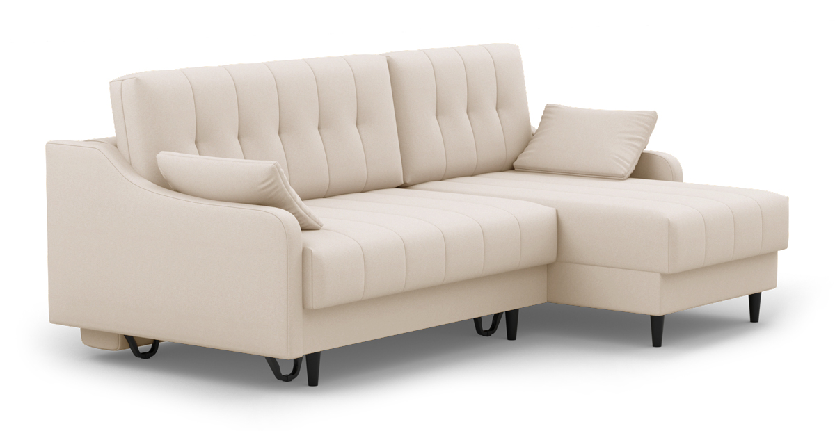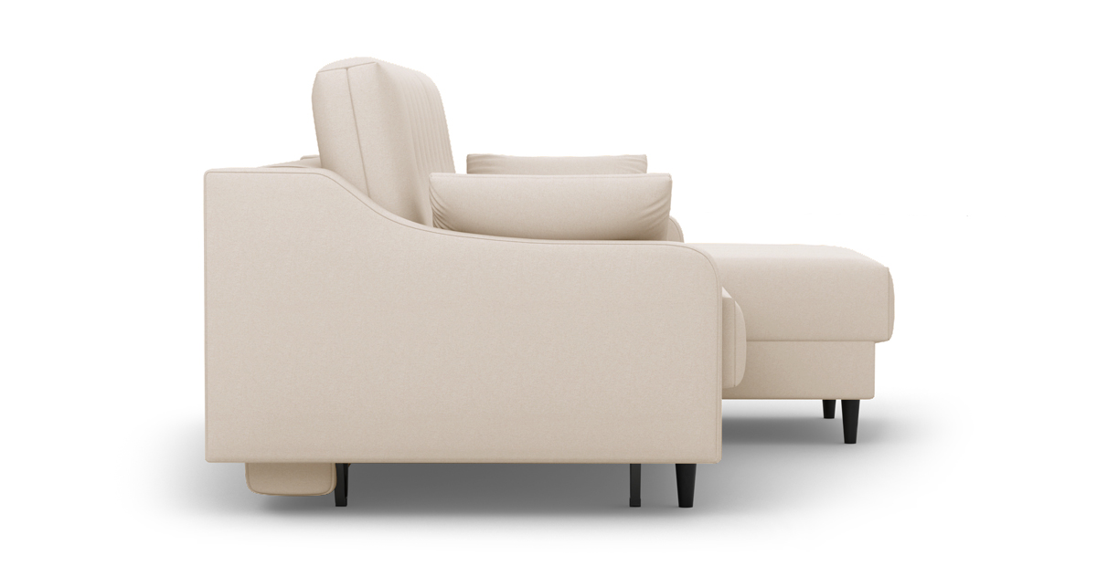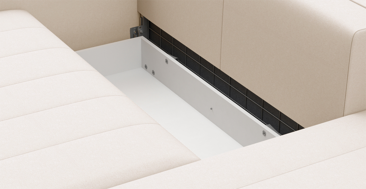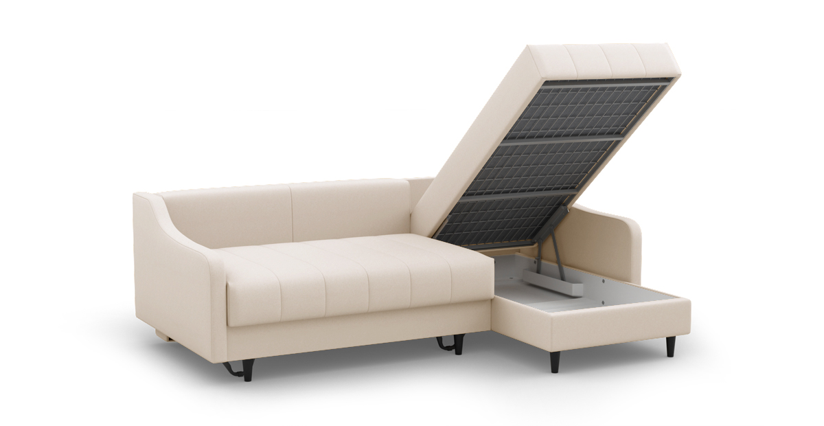 За места для хранения у дивана отвечают прочный ящик для белья с дополнительными опорами в основной секции и вместительная ниша в оттоманке.