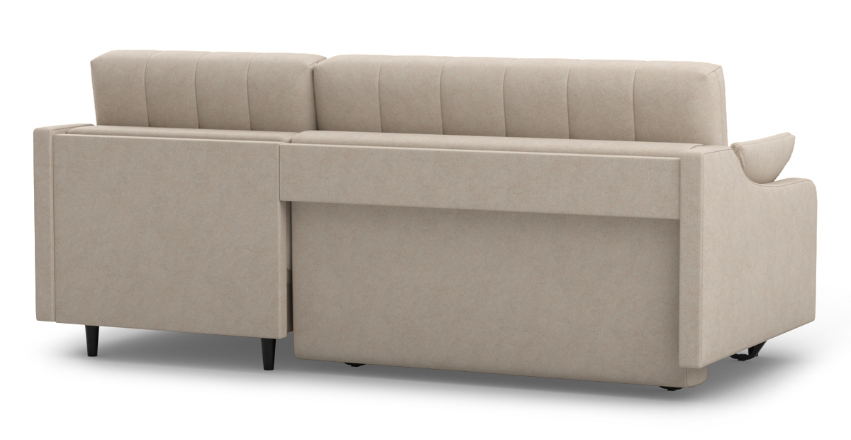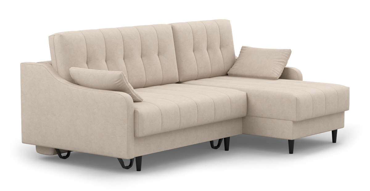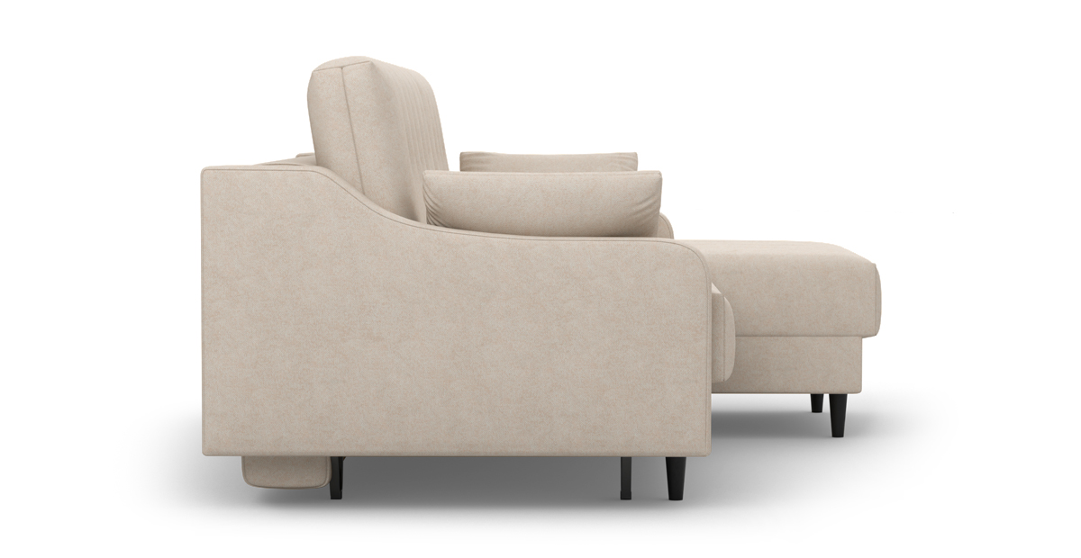 Маджента с декоративными подушками – красивый угловой диван в модном стиле mid century. Универсальные прямые формы и изящные линии подлокотников в сочетании с высокими опорами создаёт классический образ, который идеально впишется в современный функциональный интерьер. Благодаря спинке из основной ткани с его помощью можно зонировать пространство.