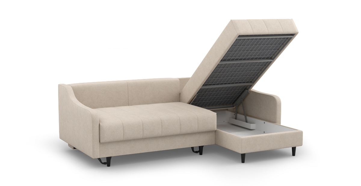 За места для хранения у дивана отвечают прочный ящик для белья с дополнительными опорами в основной секции и вместительная ниша в оттоманке.