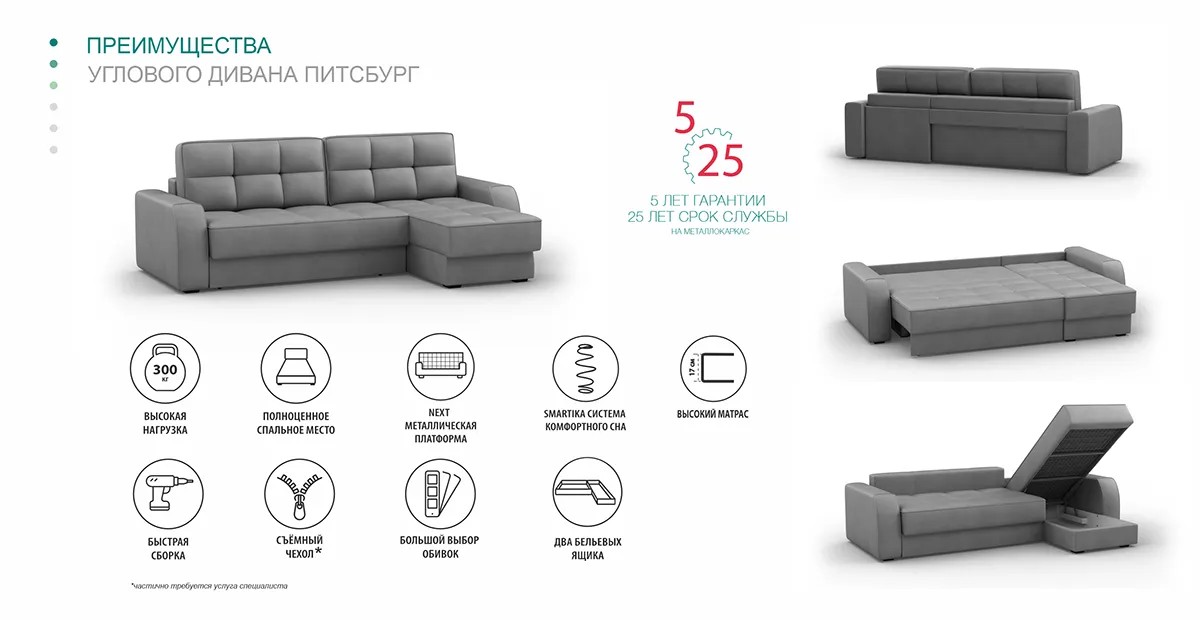 Угловой диван Питсбург – образец универсального и стильного дизайна, который будет уместно смотреться в любом интерьере. Лаконичная стёжка и декоративный кант придают дивану привлекательные черты и одновременно строгий вид. Высота и глубина посадочного места – основа идеальной эргономики. Удобный широкий подлокотник, угол наклона и поддерживающий эффект приспинных подушек обеспечивают повышенный комфорт во время отдыха. Невероятно лёгкий механизм трансформации превратит диван в полноценную кровать минимальными усилиями, справится даже ребёнок! Шагающий принцип раскладывания не испортит напольное покрытие. Надёжный современный металлокаркас не подвержен коррозии и перепадам температур. Он рассчитан на регулярную интенсивную эксплуатацию. А прочная рамка снижает вероятность появления скрипов. За места для хранения у дивана отвечают прочный ящик для белья с дополнительными опорами в основной секции и вместительная ниша в оттоманке.