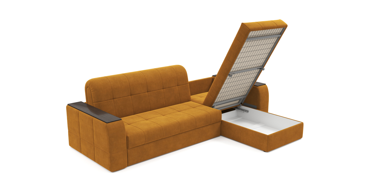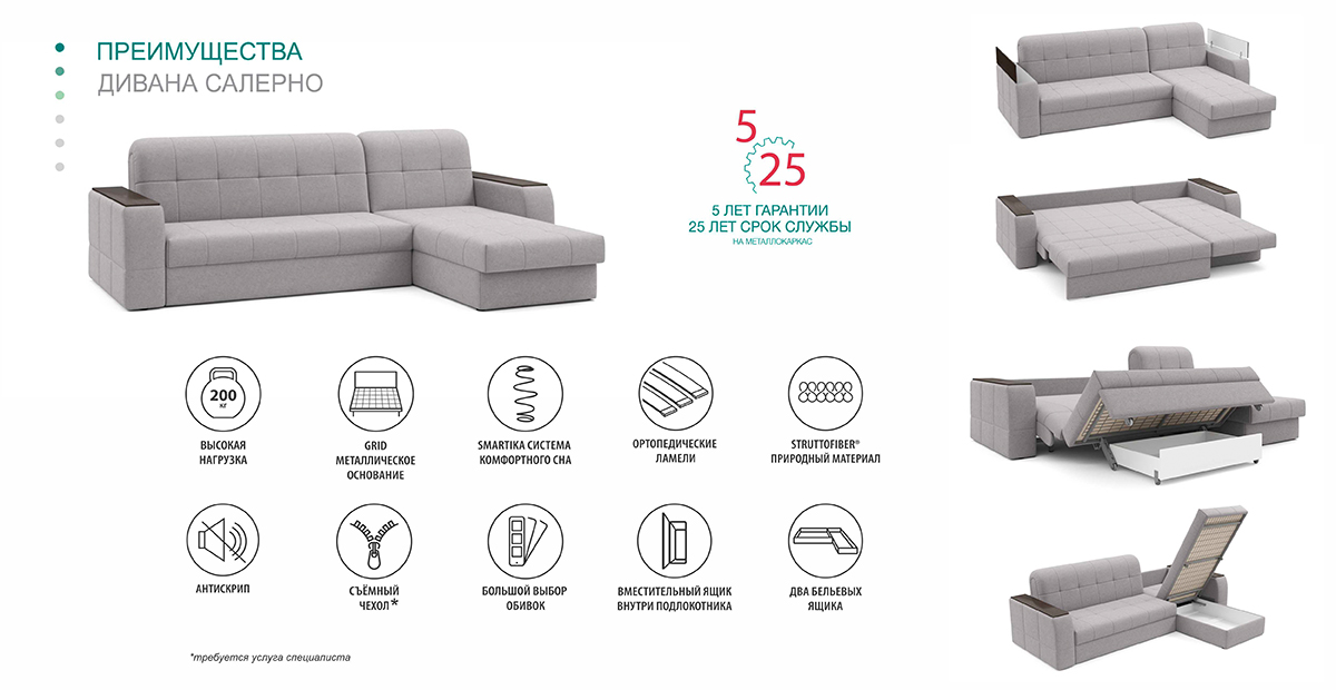 Салерно представляет собой целую систему для хранения. Вместительные ящики располагаются в раскладной секции и в оттоманке, а дополнительные ниши – в подлокотниках.